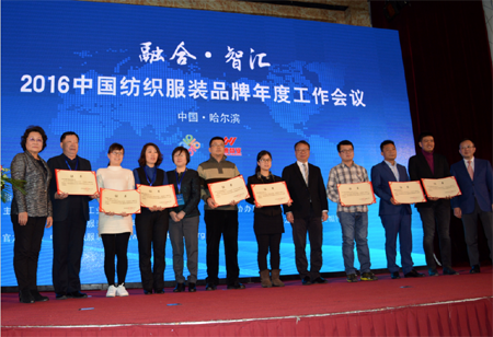 2017年1月13日,以“融合•智汇”为主题的2016中国纺织服装品牌年度工作会议在哈尔滨隆重召开。中国纺织工业联合会会长孙瑞哲,副会长陈大鹏、杨兆华,顾问张莉;工业和信息化部消费品工业司副司长曹学军等领导出席。