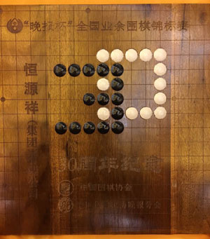 除此之外,组委会特别设置了一块合影留念板,黑白棋子拼出30的字样,以纪念赛事的三十周年。围棋棋盘作为底色,从立面的背景板一直延伸到地面,形成了很强立体效果。在这块留念板前合影,仿佛走进了棋盘之中,别具特色。