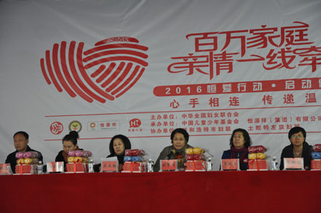 11月30日上午,内蒙古自治区“恒爱行动——百万家庭亲情一线牵”启动暨公益捐赠活动在呼和浩特市土默特左旗举行。自治区妇联副主席云翠荣在讲话中呼吁更多的爱心企业、爱心团体和爱心人士积极行动起来,投身到社会公益事业中,关注社会弱势群体、奉献一份爱心,争做社会主义核心价值观的践行者和传播者,切实帮助贫困孤残儿童健康茁壮成长。