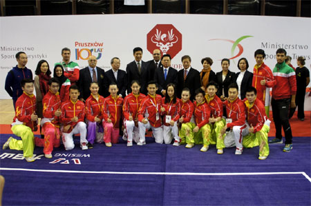 中国驻波兰大使徐坚、普鲁斯科夫市市长斯塔林斯基、波兰武联主席皮沃瓦尔斯基等嘉宾出席了开幕式并致辞。徐大使在致辞中表示,太极拳源于中国,在世界众多国家得到传承发展,它向人们提供了修身养性的一种方式,更是传播友谊的桥梁。本届锦标赛不仅给太极拳运动员提供一展才艺,相互切磋的平台,同时也为太极拳爱好者提供了一个观赏太极拳高手精彩表演的机会。