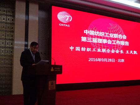 9月28日,中国纺织工业联合会第四次会员代表大会暨四届一次理事会议在北京首都大酒店圆满召开,会上顾秀莲副委员长做了致辞发言,王天凯会长作《中国纺织工业联合会第三届理事会工作报告》,总结了“十二五”纺织行业发展成绩与工作,并为“十三五”纺织行业发展方向、形势与工作提供了建议。 本次会议选举产生了中国纺织工业联合会第四届理事会理事,恒源祥(集团)有限公司总经理陈忠伟顺利当选。(通讯员■陈旭)