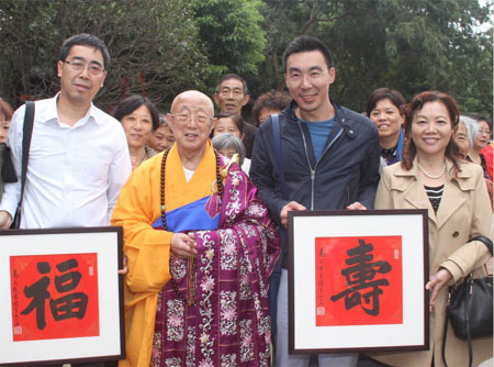 当日适逢天宁禅寺中兴方丈松纯长老九十华诞,松纯方丈生于1927年,与恒源祥同龄。恒源祥特邀95岁高龄著名书法家高式熊先生为贺松纯方丈90华诞书写“福”、“寿”二字,恒源祥集团副总经理康强代表刘瑞旗董事长及集团将这份特别的礼物送给了松纯长老。