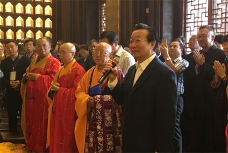 僧俗两众共同祈愿!众法师手持杨枝净水,绕场洒净加持,常州天宁禅寺护法财神殿开光法会圆满。法会上,常州市委统战部副部长、宗教局局长徐靖德先生高度评价了松纯长老的爱国爱教思想,以及对天宁禅寺多年身体力行的辛劳付出。