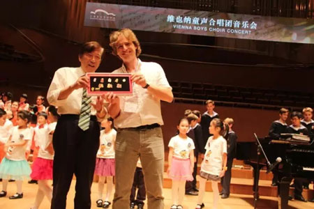 好小囡少儿合唱团团长赵家圭与维也纳童声合唱团指挥莫纳罗•卡格尼先生亲切交换礼物,亲密合影,共同祝愿两支中奥优秀少儿合唱团之间的友谊长存!(内容摘自微信公众号:上海好小囡少儿合唱团)
