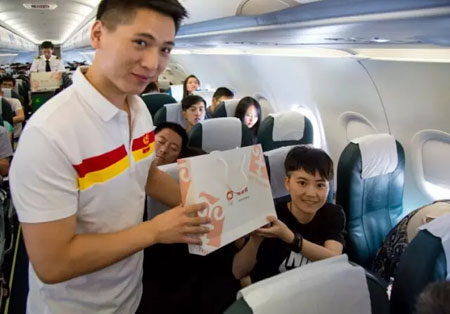 本次恒源祥时尚航班的体验从浦东机场候机大厅开始,机场大厅多处设有主题海报,机场的引导员也都换上了恒源祥奥运纪念T恤和时尚航班主题T恤热情引导乘客。在万米高空的航班上,乘务长重点介绍了恒源祥与奥运的渊源,并安排上演了两场精彩的主题走秀活动,奥运主题T恤的红、黄的配色加上恒源祥服饰2016年秋冬新款服饰秀都让人眼前一亮。