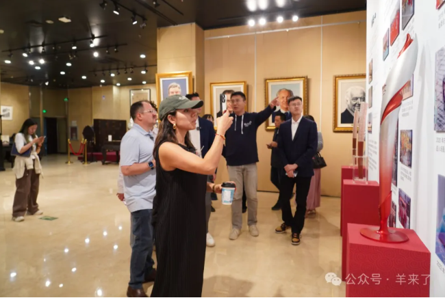 在恒源祥北京公司李艳艳、欧阳、李立志的全程陪同下,国际访客们沿着企业历史长廊,深入探访这家百年老字号的传奇历程。当步入非遗展示区时,海派绒绣的匠心之作令外国友人屏息驻足——传承人手中的羊毛绒线仿佛被赋予生命,以针为笔、以线为墨,在特制网眼布上绣制出堪比西方油画的立体质感。高飞对绒绣肖像工艺产生浓厚兴趣,用镜头定格了每一幅绒绣作品。
