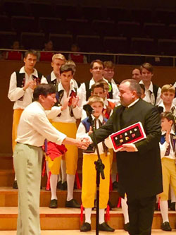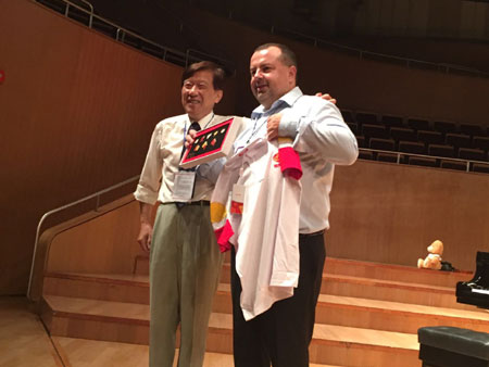(好小囡少儿合唱团团长赵家圭向捷克合唱团团长赠送礼物,捷克合唱团团长非常喜欢这件恒源祥“番茄炒蛋”助力奥运纪念版T恤及这套恒源祥奥运纪念徽章)