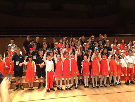 (在昨晚演出的下半场,捷克好小囡代表身穿恒源祥“番茄炒蛋”助力奥运纪念版T恤,用中文演唱了中国陕北民歌《黄河船夫曲》获好评)