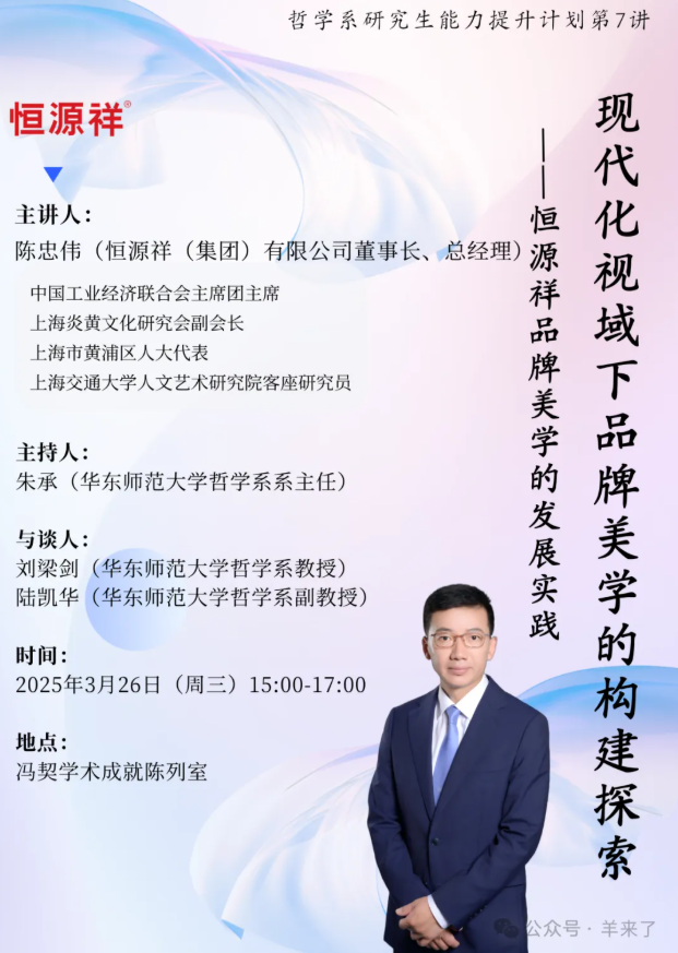 3月26日下午,恒源祥集团董事长兼总经理陈忠伟受邀前往华东师范大学闵行校区,为哲学系的研究生们带来了一场内容丰富的讲座。此次讲座是华东师范大学哲学系研究生能力提升计划第7讲,地点设在冯契学术成就陈列室。