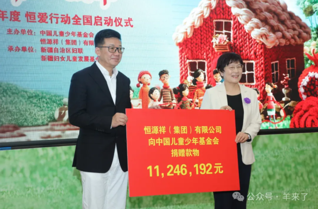 在2024年度“恒爱行动”启动仪式上,恒源祥集团向中国儿基会捐赠款物1124万余元