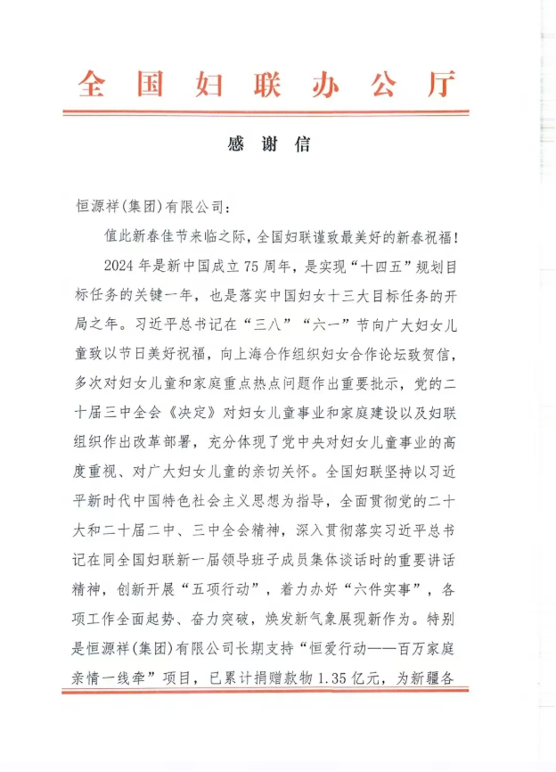 在感谢信中,全国妇联高度评价了恒源祥集团对“恒爱行动”的大力支持,并对恒源祥为服务党和国家工作大局、呵护儿童健康成长、全面发展以及构建家庭友好型社会所作出的积极贡献表示衷心感谢。这既是对恒源祥过去努力的肯定,也是对大家未来继续前行的鞭策。恒源祥将继续秉承“以爱之名,共织温暖”的公益理念,携手更多爱心人士、企业或组织,共同为构建更加和谐美好的社会贡献力量。