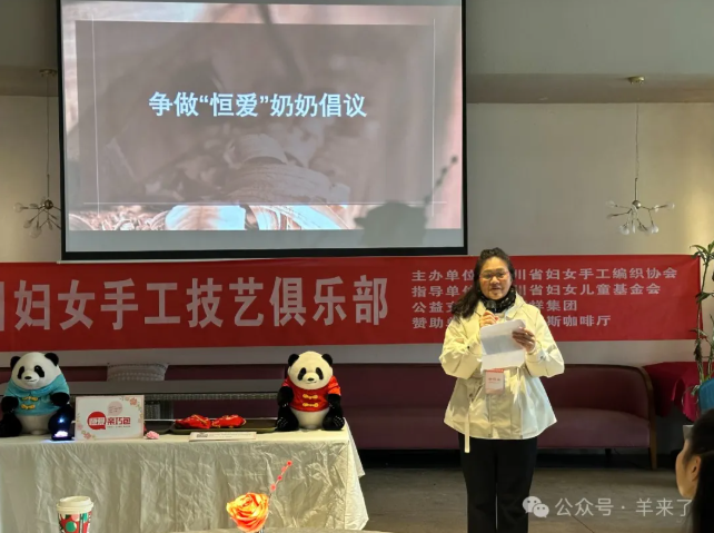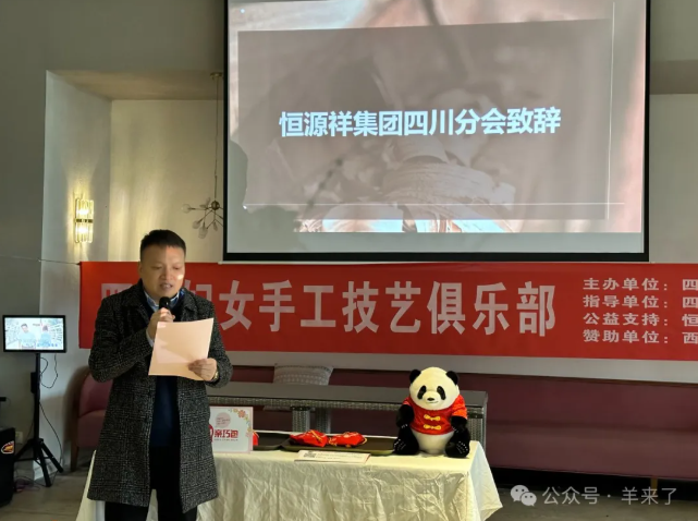 恒源祥四川分会副会长蔡惠东致辞,他表示恒源祥品牌一直以来都秉持着为社会创造价值、持续做公益的宗旨。四川妇女手工技艺俱乐部的成立,将为“银发一族”提供一个学习特长、交流互助、疗愈康养的平台,同时还能传承非遗文化、促进灵活就业。恒源祥四川分会希望与俱乐部探索更多的合作模式,从公益、产业、产品各个层面发力,建立可持续发展机制,服务“银发经济”增长。