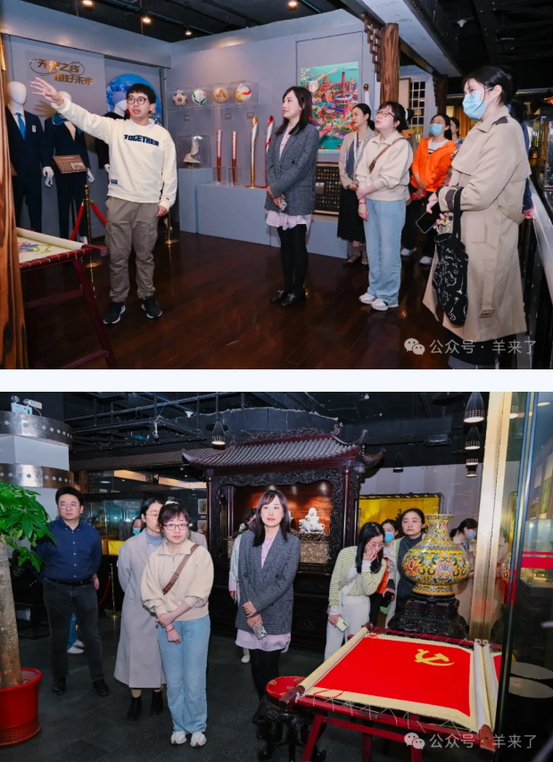 来访党团员们首先来到位于恒源祥一楼的文化艺术展厅,通过沉浸式的参观,对恒源祥的文化、体育、公益、非遗等品牌事业有了更深入的了解。