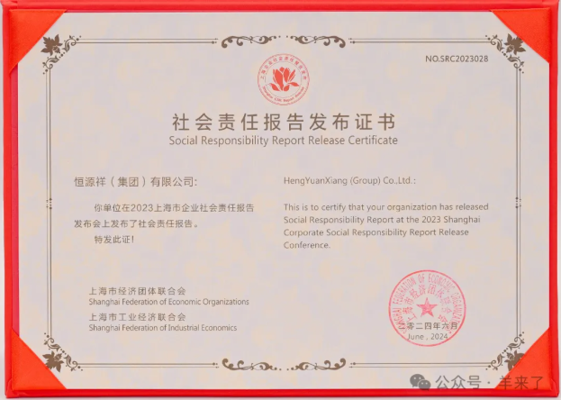 11月29日,由上海市工业经济联合会、上海市经济团体联合会主办,上海市质量协会承办的“企业社会责任推进交流活动”顺利举办,参与2023上海市企业责任报告发布的恒源祥集团等企事业单位与行业协会领取了社会责任报告发布证书。