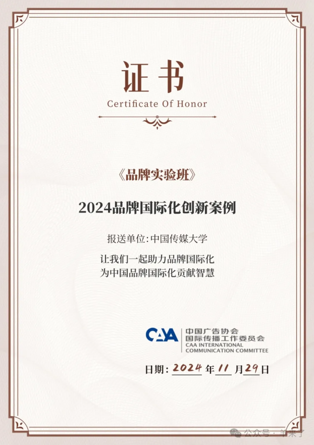 11月29日,第31届中国国际广告节2024品牌国际化论坛揭晓了“2024品牌国际化创新案例”评选结果,中国传媒大学“擘雅·品牌实验班”获评2024品牌国际化创新案例。