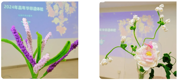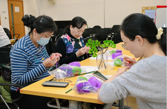 活动现场还特地布置了在2024第七届进口博览会上展出的绒线花四叶草盆景,在花团锦簇中,大家围坐一起,聚精会神地聆听老师的讲解和示范,迫不及待地上手尝试,在老师悉心指导下,一枝枝美丽而充满生机的“薰衣草”从一双双巧手中“诞生”。