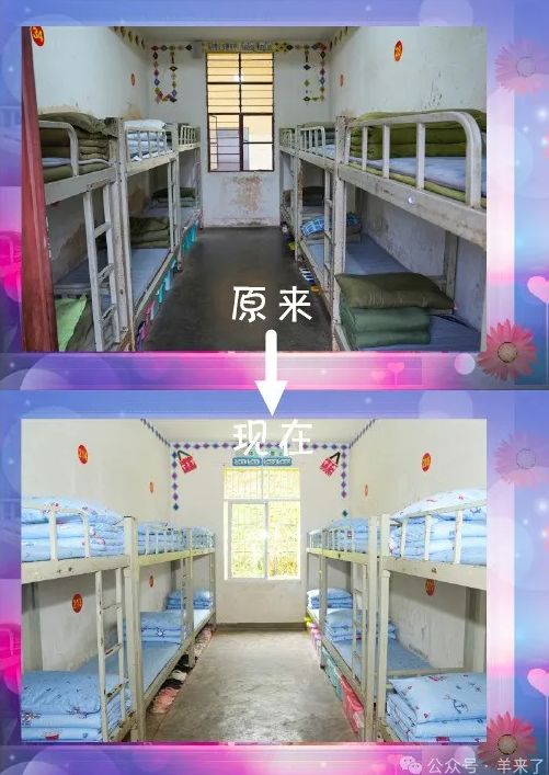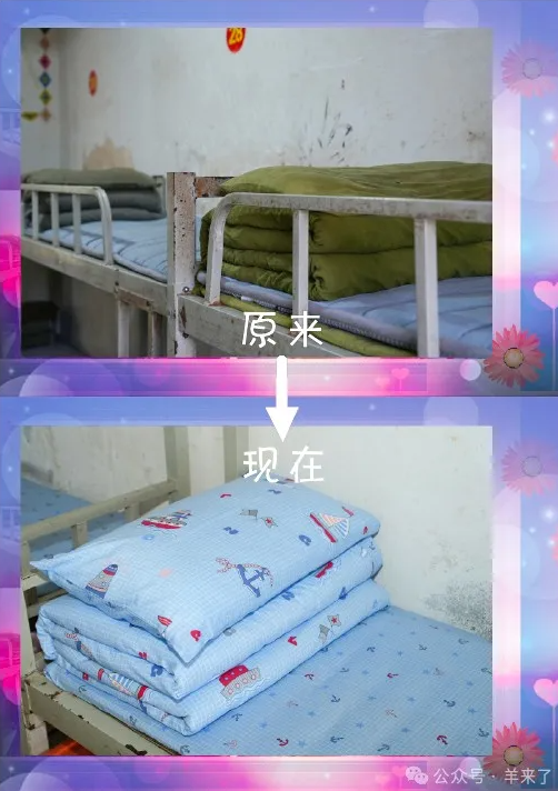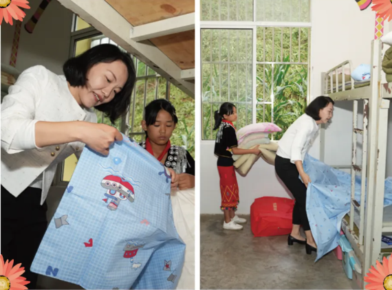 图:公益项目组走进宿舍与孩子们一起为床铺换上“新衣服”