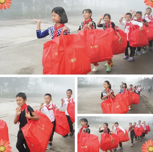 图:孩子们欣喜地背着恒源祥家纺五件套前往宿舍