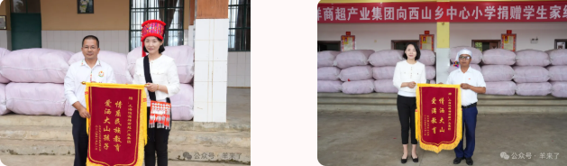 图:西山乡营盘民族小学和西山乡中心小学分别向恒源祥赠送锦旗,以表感谢