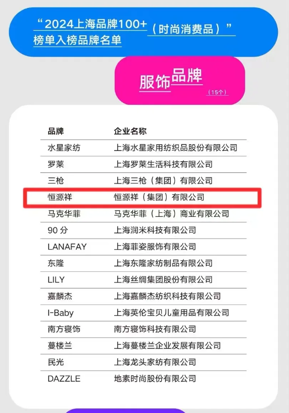 此次论坛重磅发布了“2024上海品牌100+(时尚消费品)”榜单。榜单按“时尚八品”分类,本次荣登入榜的97个品牌,是从自主申报等方式产生的201个品牌中,通过定量定性模型比对遴选产生,“恒源祥”品牌荣登“2024上海品牌100+”。榜单的发布将有助于推进上海时尚消费品产业高质量发展,助力上海建设国际消费中心城市。未来,恒源祥将继续以设计赋能品牌增长,紧跟上海设计之都、时尚之都、品牌之都“三都”建设的步伐,努力走向品牌的高端化、时尚化和国际化。