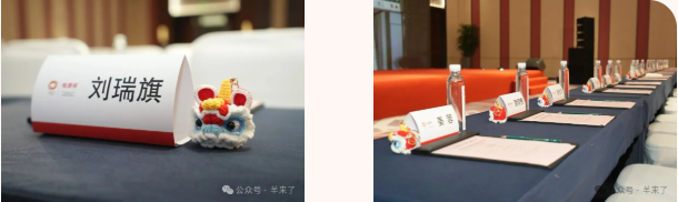 嘉宾桌上摆放了红红火火的醒狮绒线编织工艺品,寓意瑞狮呈祥、求吉纳福。每位参会代表佩戴的手编绒线小羊胸针,寓意吉羊如意、羊瑞盈门。