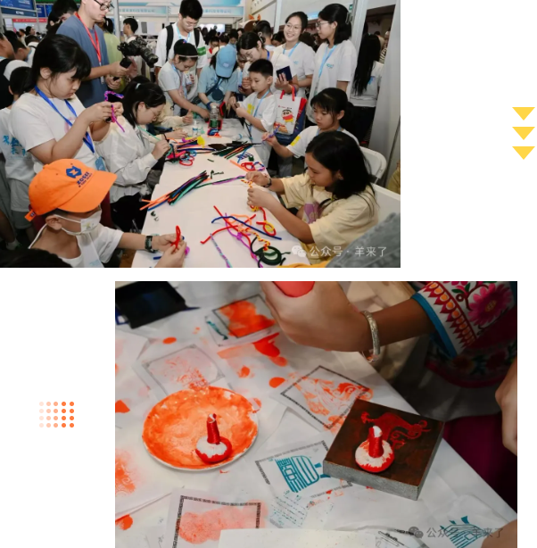 行走的小囡吸引了小发明家们驻足拍照留影,现场通过互动体验的方式,套章、拓印、DIY书签、扭扭棒制作奥运五环和花束,孩子们在趣味中感受传统文化的魅力。