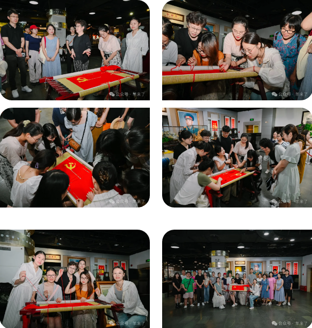 在恒源祥文化艺术展厅,通过实物参观了解了恒源祥创始人的故事、恒源祥与奥运的故事,公益慈善以及非遗项目。随后,师生们在海派绒绣国家级传承人、恒源祥绒绣原创工作室首席工艺师李蔷老师以及95后传承人马俊、蒋馨瑶的指导下,体验了绒绣党旗,重温了西藏民族大学于2021年通过“同心向党 共绣党旗”与恒源祥结成的友谊。