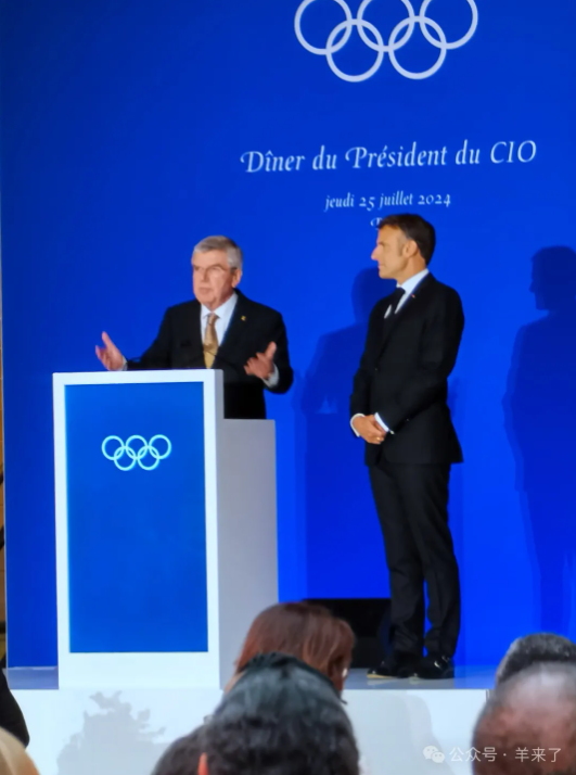 晚宴伊始,法国总统马克龙与巴赫主席一起上台对来自世界各地的嘉宾表示热烈欢迎。