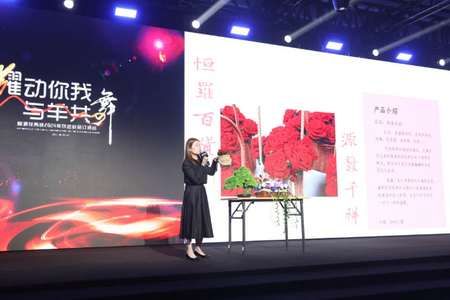 恒源祥绒线产业总经理助理杨维珍介绍了绒线元素在实体终端、伴手礼开发、多元化艺术品呈现等方面做的积极探索。她还着重介绍了现场陈列的由绒线产业自主研发制作的绒韵花海、绒耀柏年、绒染朱韵、绒簇梅香、小羊胸针等多款绒线工艺展品。