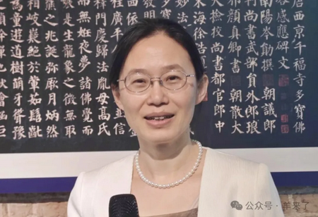 英国皇家霍洛威学院研究员奥黛丽·韦尔斯认真观看展览
