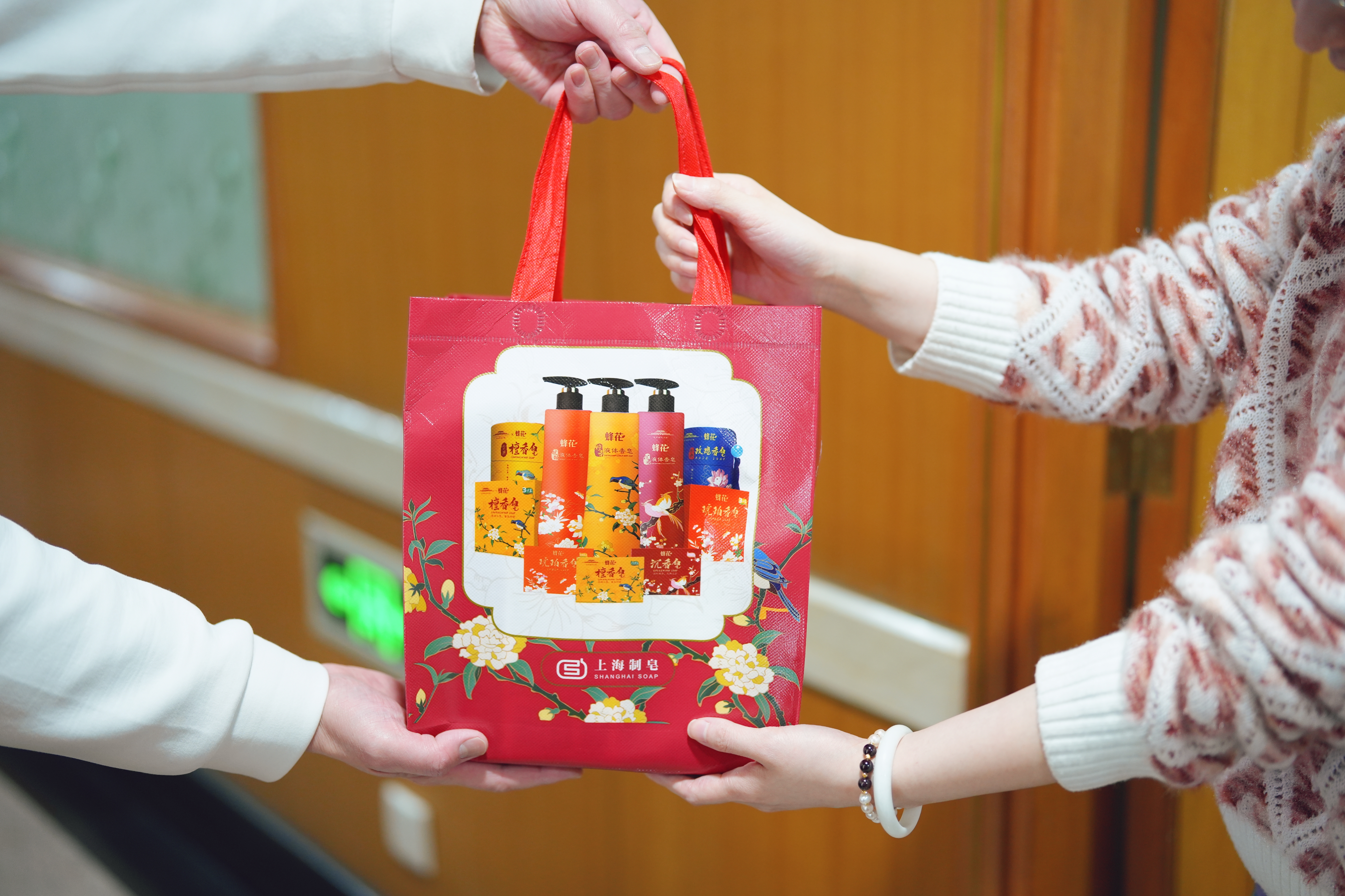 一进公司,她们就被眼前的一幕所震撼。只见各色花神手串摆放在红色台面上,一束“永不凋零”的绒线花束摆放于正中,散发着浓郁的节日氛围。礼品袋内,一条条精致的花神手串静静地等待着它们的主人。