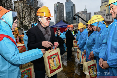 黄浦区广场065地块项目建筑工地的一线工人以外来务工人员为主,新春佳节即将来临,他们仍不畏严寒,坚守岗位,为城市的建设默默奉献着自己的力量。外滩街道领导以及工地所在的云南居委对此高度重视,第一时间组织开展慰问活动,向他们送上关怀和温暖。恒源祥作为辖区企业,积极响应,带头参与,向工地外来务工人员赠送了80套全棉内衣,上海市劳模、恒源祥集团董事长兼总经理陈忠伟亲临现场,为他们送上物资与祝福。