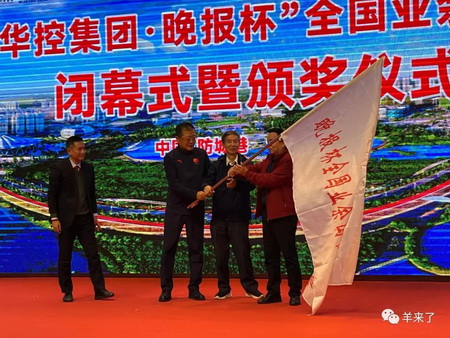 闭幕式的最后,王汝南、袁虹衡和防城港市的代表与明年第37届“晚报杯”的承办方、海南临高县的代表进行了会旗交接。