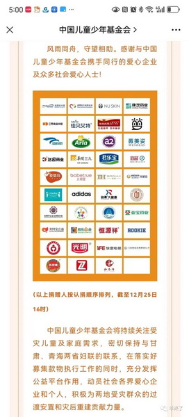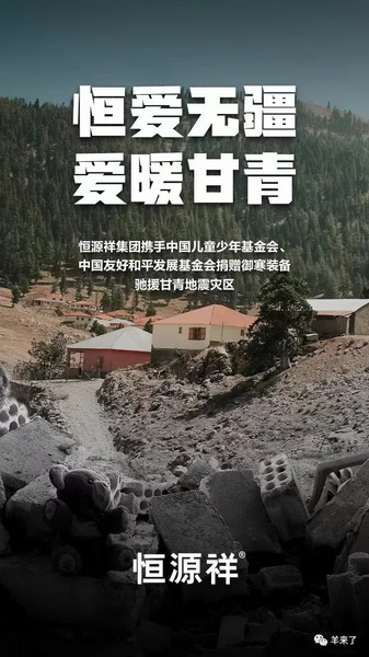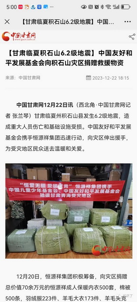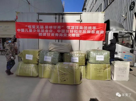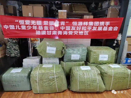 中国友好和平发展基金会、甘肃省外办特别致电感谢恒源祥集团,称赞恒源祥是一个有着大爱的企业,将捐赠的物资第一时间送到受灾居民的手里。