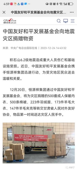 在甘肃积石山县受灾现场,恒源祥捐赠的物资已通过中国友好和平发展基金会陆续抵达临夏州积石山县。据基金会介绍,甘肃省外办已陆续接收到恒源祥集团、创造美好未来潘基文基金会等企业和公益组织的物资,也第一时间将物资分发给受灾居民,并希望灾区人民早日重建家园,重拾美好生活!