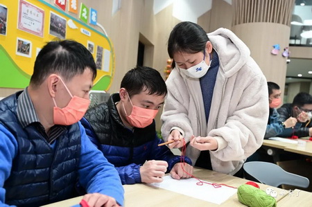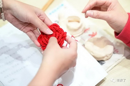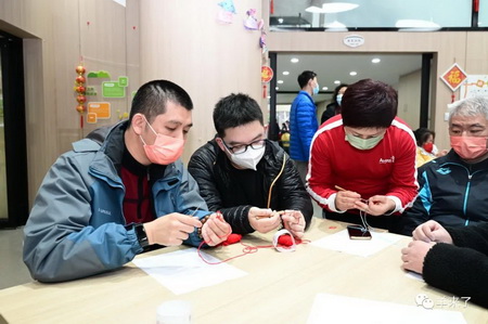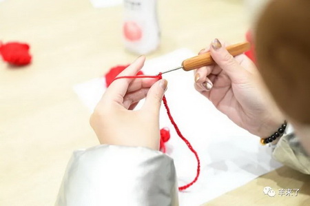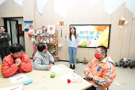活动现场,阳光之家的学员们在恒源祥非遗工作室工艺师马俊等人的亲手指导下体验了海派绒线编结技艺,了解基本的针法以及编织的成品,学员们在双方志愿者地帮助下尝试编织一朵象征着“荣誉和感谢”的志愿者小红花。他们纷纷亲身体验,感受绒线编结带来的独特触感与千变万化,虽然动作不快,但从他们专注的眼神中,可以看到对学习的渴望和对生活的热爱。不少学员提出,希望能经常开展这样的非遗课程,给他们更多的学习机会。