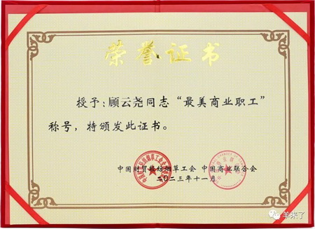 11月16日在广州举办的中国生活服务业大会上,中国财贸轻纺烟草工会联合中国商业联合会共同发布了开展寻找“最美商业职工”活动结果。经各地推荐、网络投票、专家评审等程序,最终恒源祥(集团)有限公司工会主席顾云尧等60人获得“最美商业职工”称号。