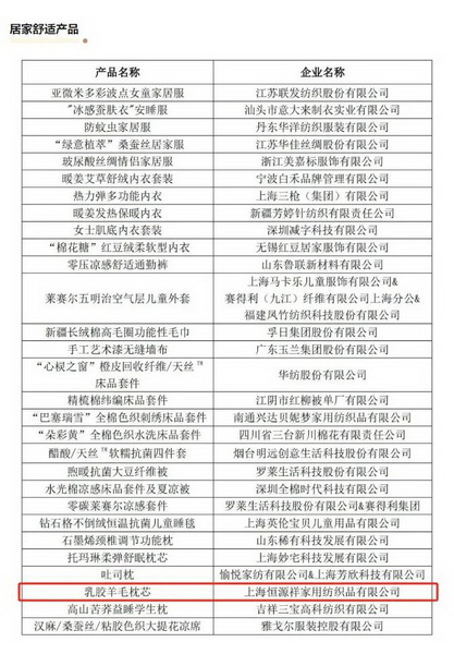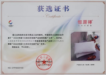 经过中国纺织工业联合会生产力促进部对申报企业及产品的资格和形式审查、消费者投票和专家评定,恒源祥家纺“乳胶羊毛枕芯”,荣获“2023年度十大类纺织创新产品”称号。产品隶属于居家舒适产品类。