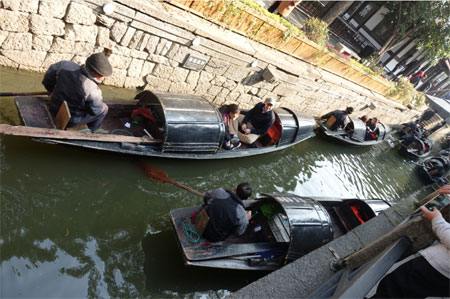 “黛瓦粉墙,深巷曲异,枕河人家,柔橹一声,扁舟咿呀。”一顶乌毡帽、一枝橹,吱吱呀呀地摇着乌篷船穿过大桥小桥,远处青山似迎面而来。一踏入这片古越之地,一行人就好比走进了一轴民俗风情画,流连忘返。