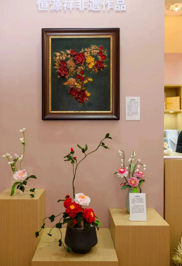 同时,恒源祥集团还展出了依托“上海绒绣”国家级非遗和“海派绒线编结”上海市级非遗而创意设计并开发的两项非遗精品——《绽放绒花情》和《绒情富贵》。