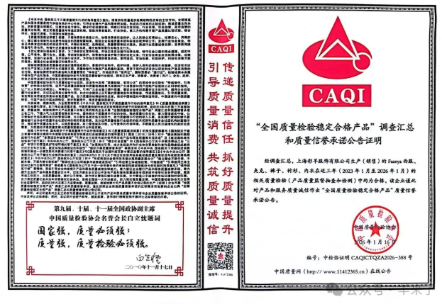 近日,中国质量检验协会发布了“全国质量检验稳定合格产品”调查汇总结果。彩羊服饰生产(销售)的Fazeya西服、夹克、裤子,衬衫、内衣在近三年(2023年1月至2026年1月)的相关质量检验(产品质量监督抽查和检测)中均为合格。